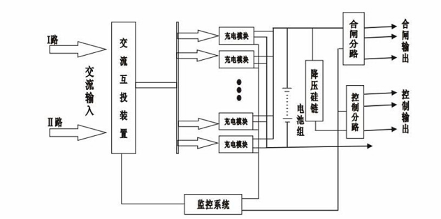 直流屏工作進程簡化為充放電的循環。當蓄電池電量足夠時處于浮充情況,由充電模塊向開關柜控制母線體系跟合閘母線體系等設備供應小電流。若發生斷電現象,關閉充電模塊,由蓄電池向負載供應電能,保證斷電后,高壓開關柜等設備仍可正常工作一段時間,為缺點打掃爭奪最大的時間差,防止呈現傳達信號間斷的情況。當電路恢復正常充電模塊則重新啟動,向母線體系等設備繼續供應小電流,并對蓄電池充電,布滿后切換成浮充情況。